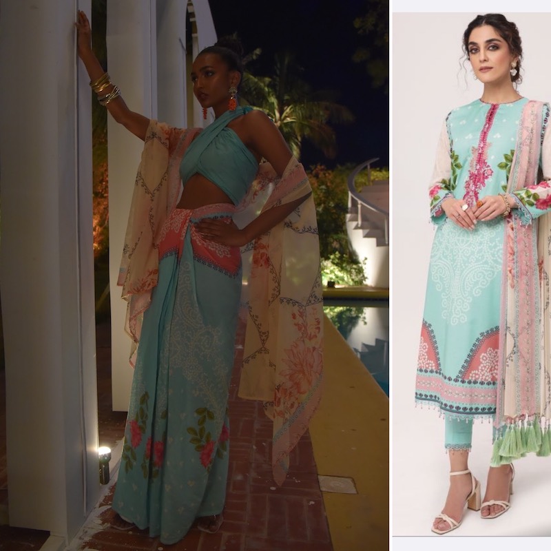 In Pakistan, we usually think of the sari as occasion-wear, style for celebrations, such as a graduation party, a formal evening out or even a grand valima. The sari does play another role though; it works it’s very best as light and breezy summer wear. So many of us buy lawn suits and make very little use of the dupatta. Whether the dupatta is lawn or chiffon, you can turn it into a sari (if you choose to buy 2 lawn sets as you’ll need 6 yards for the sari) or then work out a half sari with one lawn set. For the sari you can use the trouser or shirt fabric for your blouse and petticoat or then get the best of both and go for a kurta shalwar too!