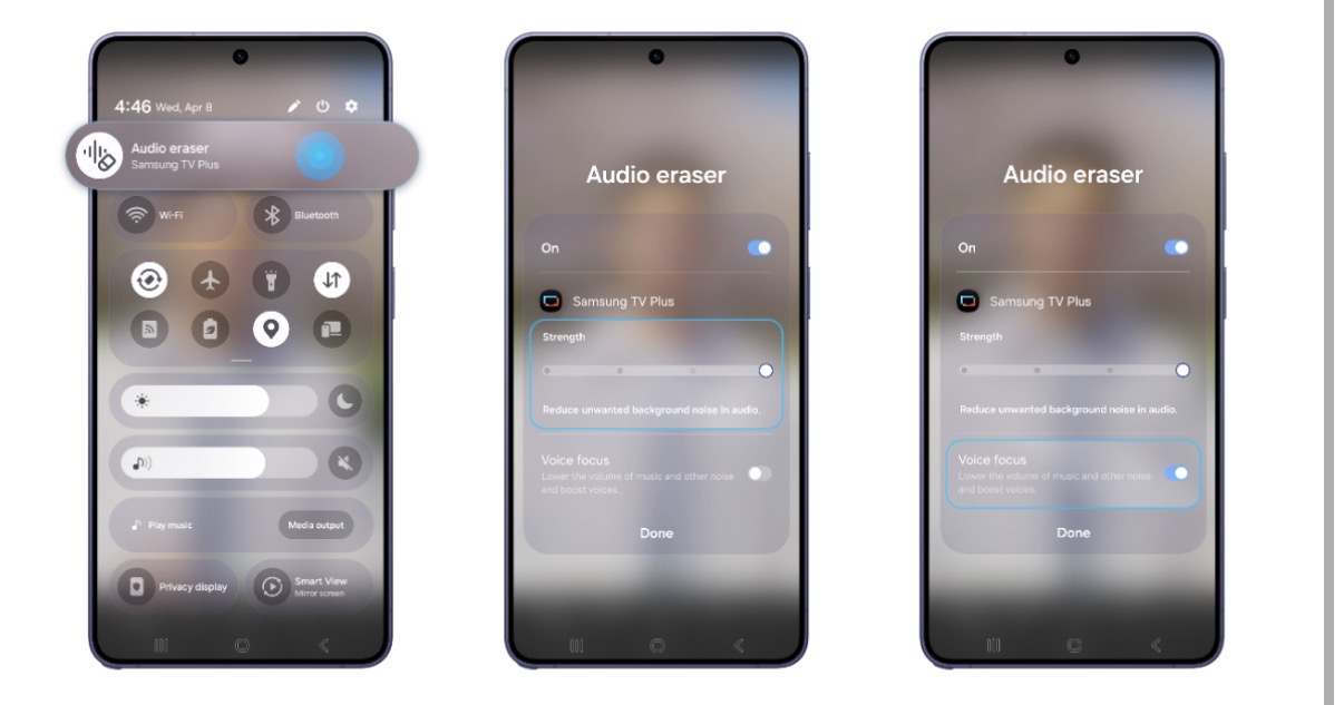 Access Audio Eraser via the Quick panel on the Galaxy S26 series, with controls to adjust “Strength” and enable “Voice focus.”