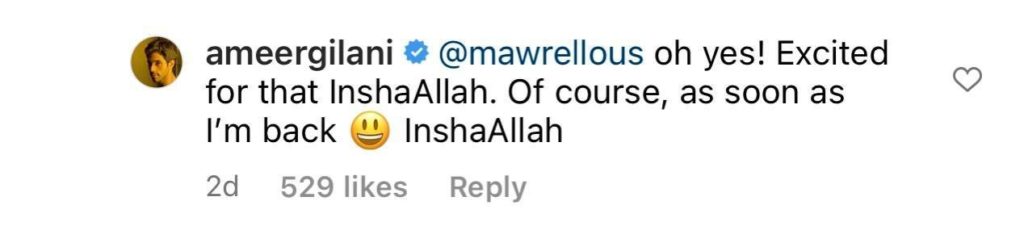 His co-star in Sabaat and friend Mawra Hocane, who is also a law graduate, congratulated him on his big achievement and asked for a “treat” like all friends do. There was also a hint at a project in which they will be working together. So, Ameer replied: “oh yes! Excited for that InshaAllah. Of course, as soon as I’m back. InshaAllah.”