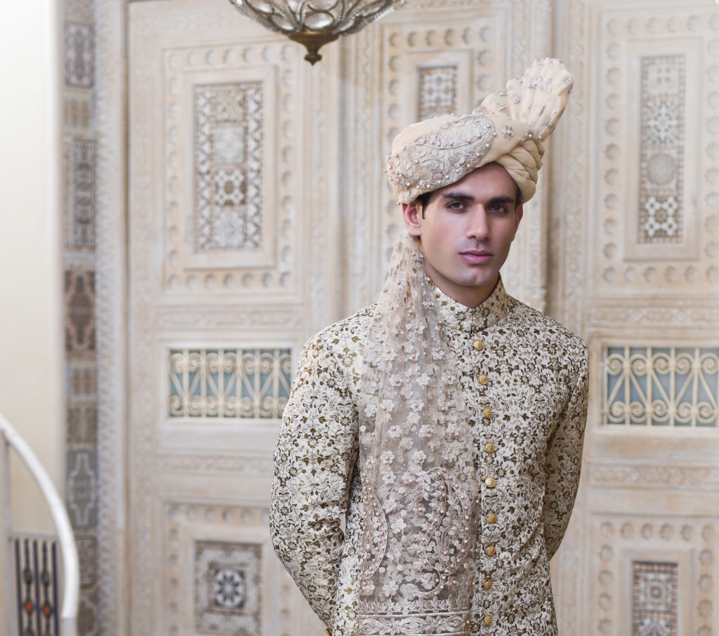 The regal package includes all the basic needs of a groom, from an intricately embroidered and expertly tailored sherwani, to the perfect accessory to go with it; a turban and a stole. To tie up the whole look, the package also includes a pair of khussas and an inner suit to the complete the perfect traditional look.