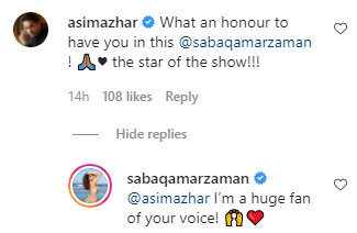 The video of the song features Fahad Mustafa and Saba Qamar. Under Saba’s post, Asim shared that it was a pleasure to work with her and called her “the star of the show” while the diva replied that she is a huge fan of his voice.