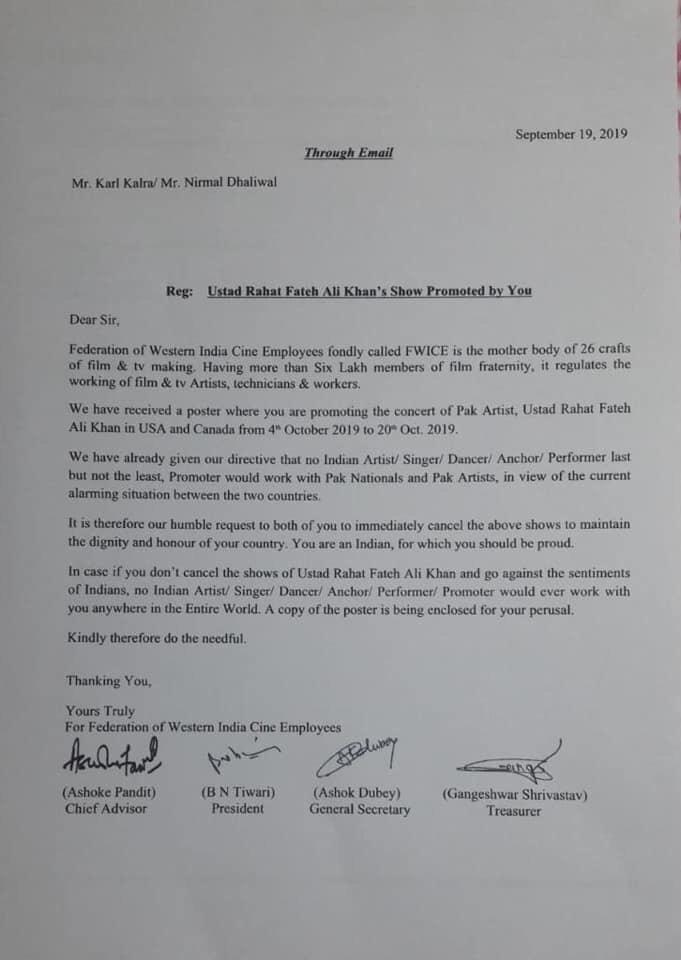 FWICE wrote in the warning letter issued to the two that “we have received a poster where you are promoting the concert of Pakistani artist, Ustad Rahat Fateh Ali Khan in USA and Canada from 4th October, 2019 to 20th October, 2019.”