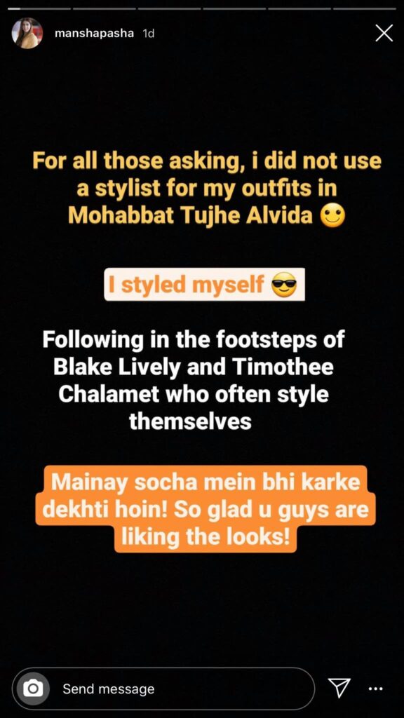 Speaking of the concept of reusing clothes, Mansha told Something Haute that she’s reused her own clothes multiple times.” I’ve reused my own clothes many times as you know most of the outfits in MTA (Mohabbat Tujhe Alvida) were also my own.”