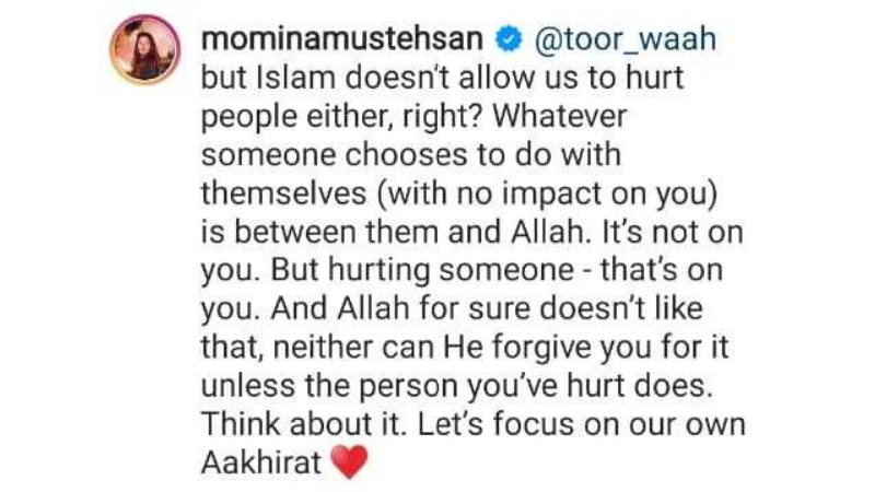 “Islam doesn’t allow us to hurt people either, right? Whatever someone chooses to do with themselves (with no impact on you) is between them and Allah. It’s not on you. But hurting someone — that’s on you,” she replied to another user accusing Alizeh of offending religion.