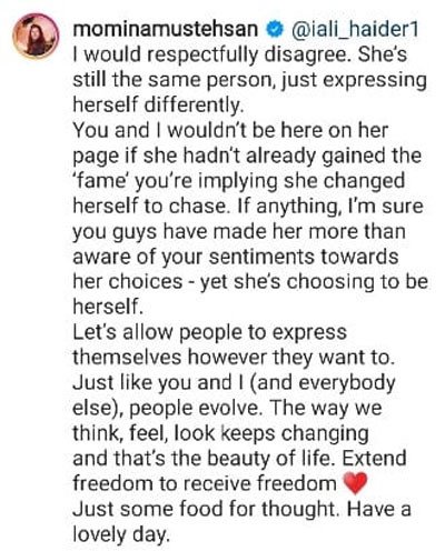 However, it was great to see singer Momina Mushtehsan stepping in to defend Alizeh. “I would respectfully disagree. She’s still the same person, just expressing herself differently, replied Momina when a user shared how Alizeh has lost her beauty, in search of fame.